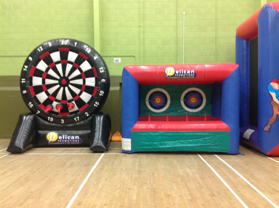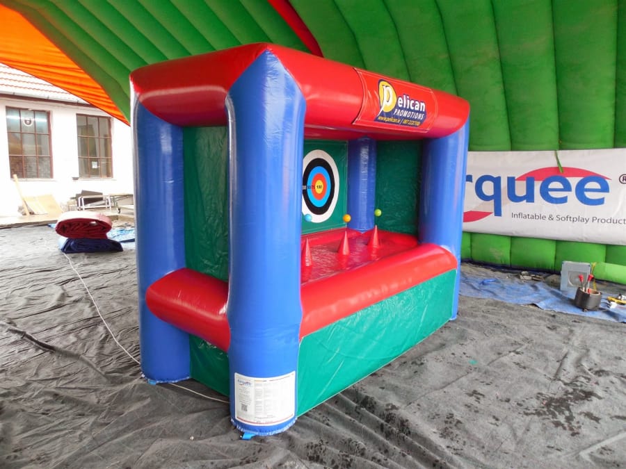 target board behindDouble task game were you try shooting the hovering balls and try get a bulls eye on the