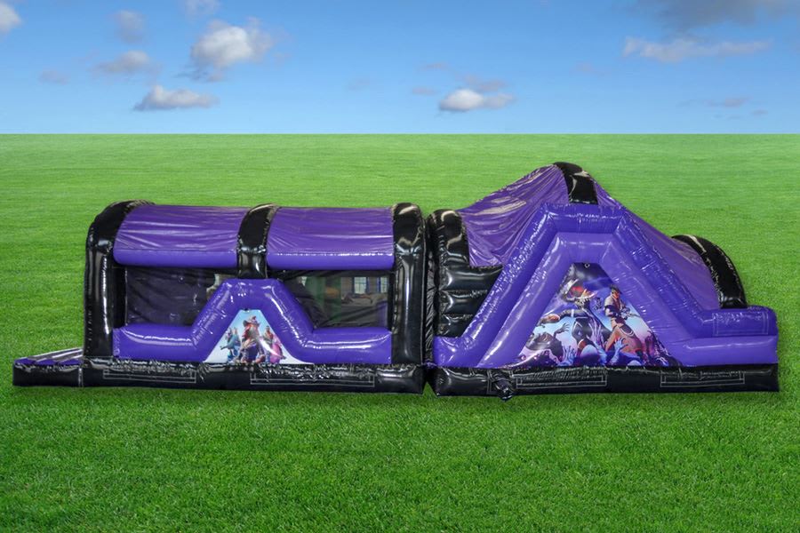 And what's better is when you hire it, we put it together and take it apart for you. It's 12m long with integrated slide and loads and loads of obstacles!!! The perfect combination!
