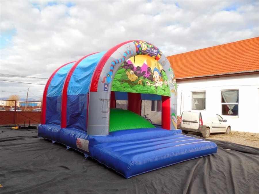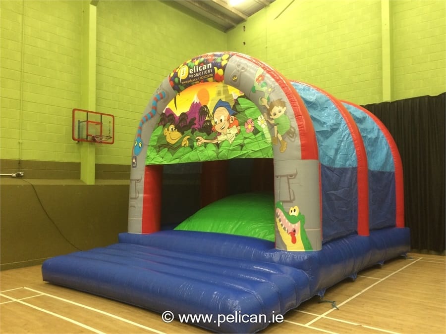 Fully covered bouncy castle with netted sides.