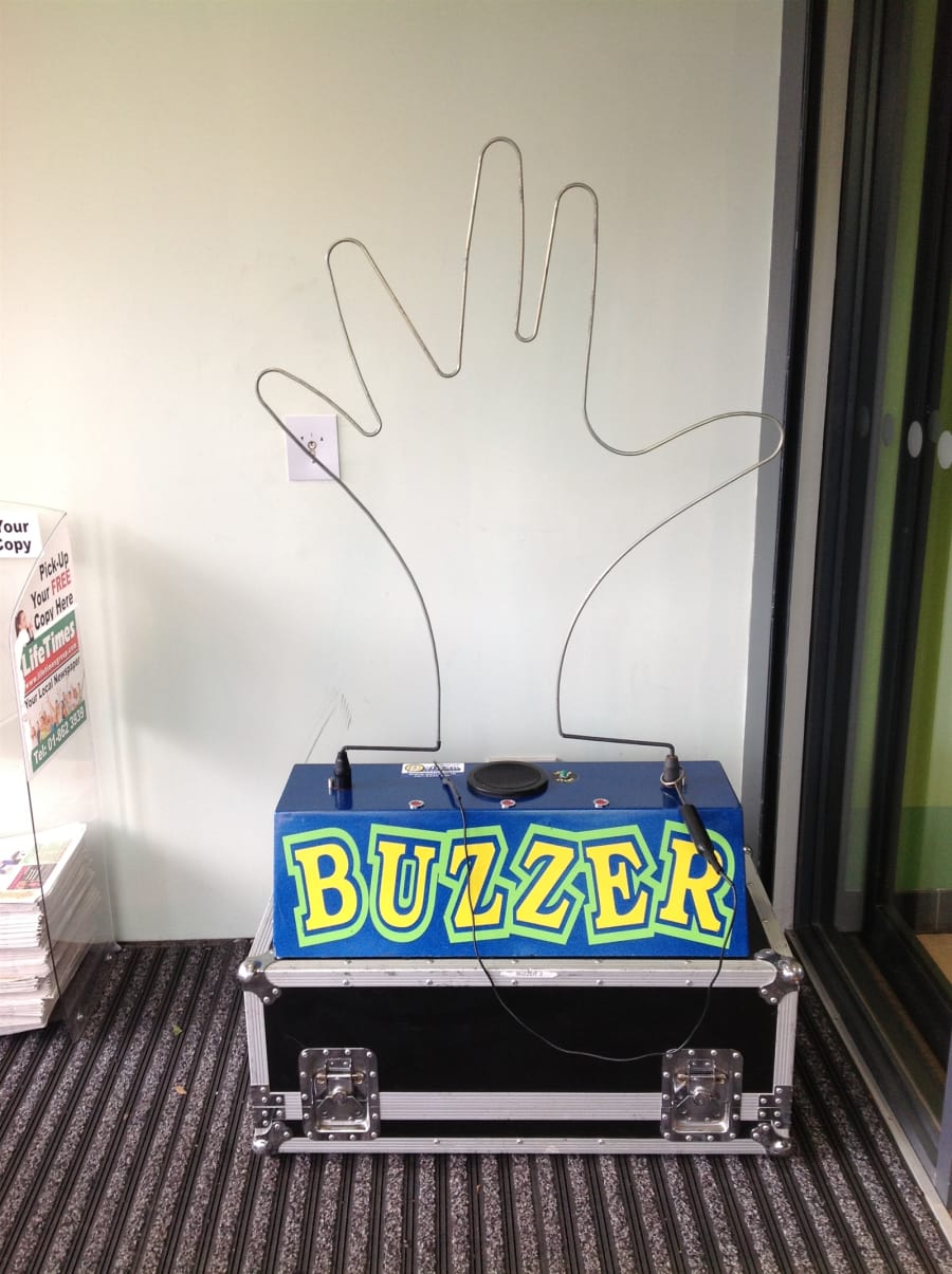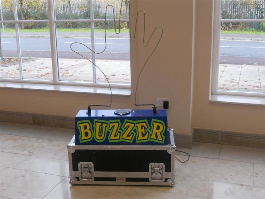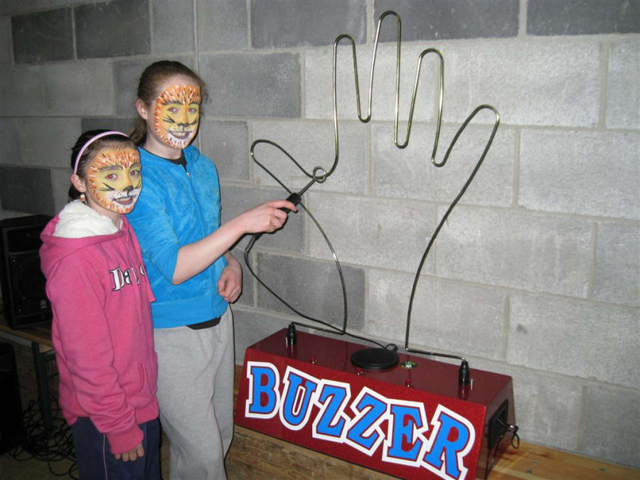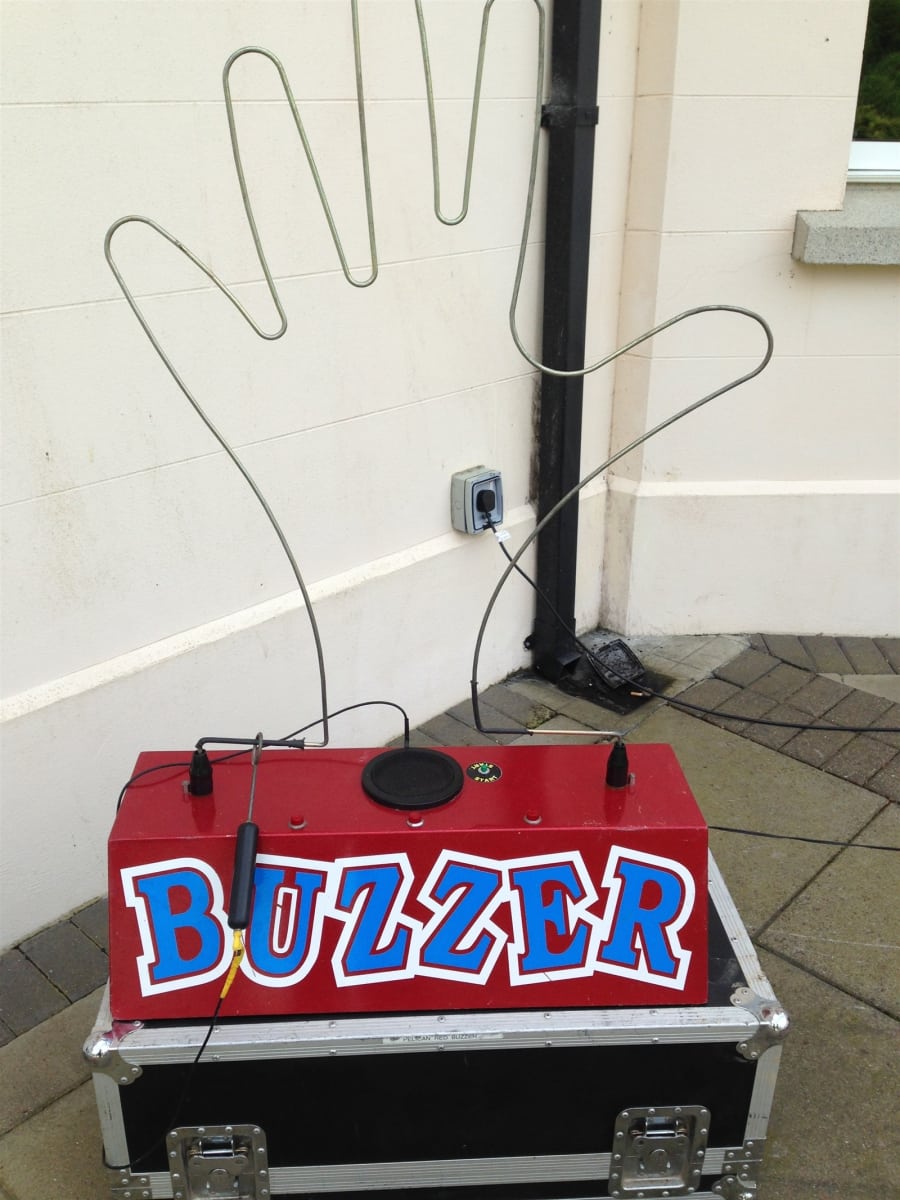 The buzzer is a test on stability, you have 3 chances to direct the ring around the hand without touching or you will be Buzzed out. The person with a steady hand will make it look easy. Comes in blue or red.
