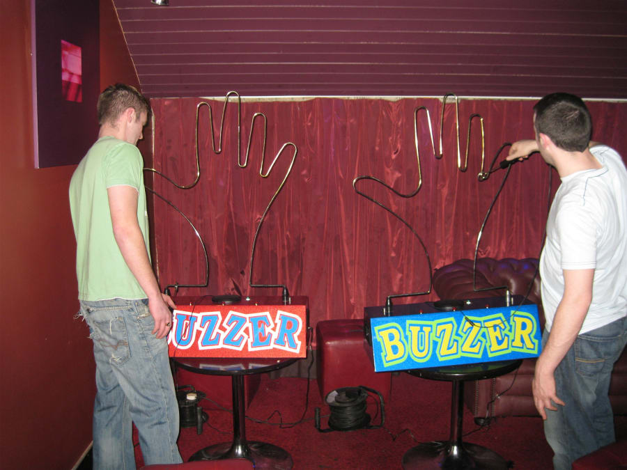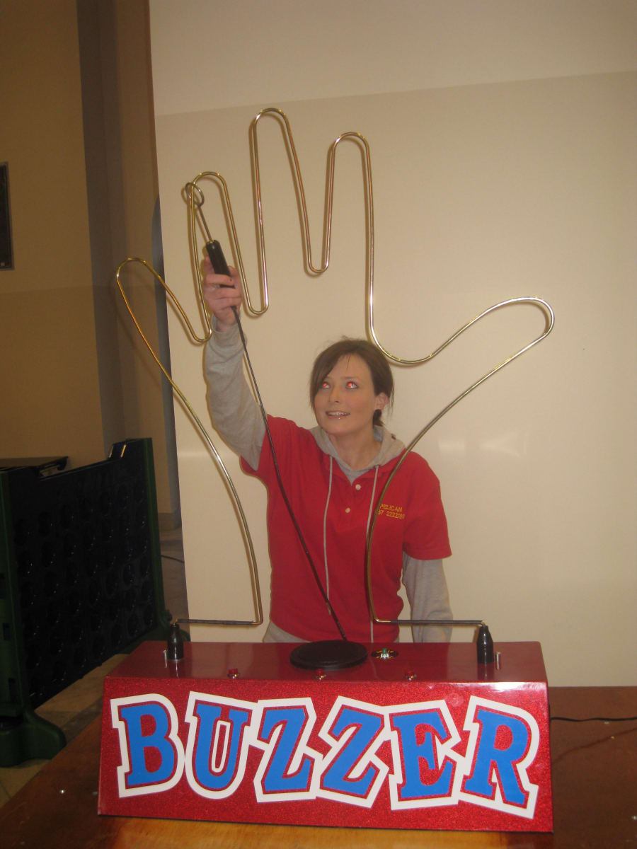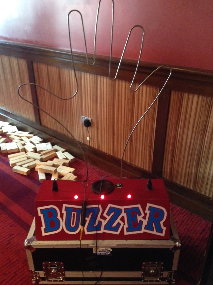 The buzzer is a test on stability, you have 3 chances to direct the ring around the hand without touching or you will be Buzzed out. The person with a steady hand will make it look easy. Comes in blue or red.