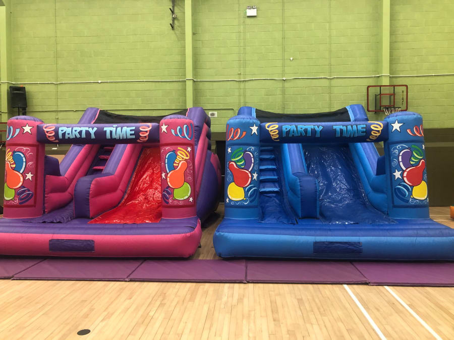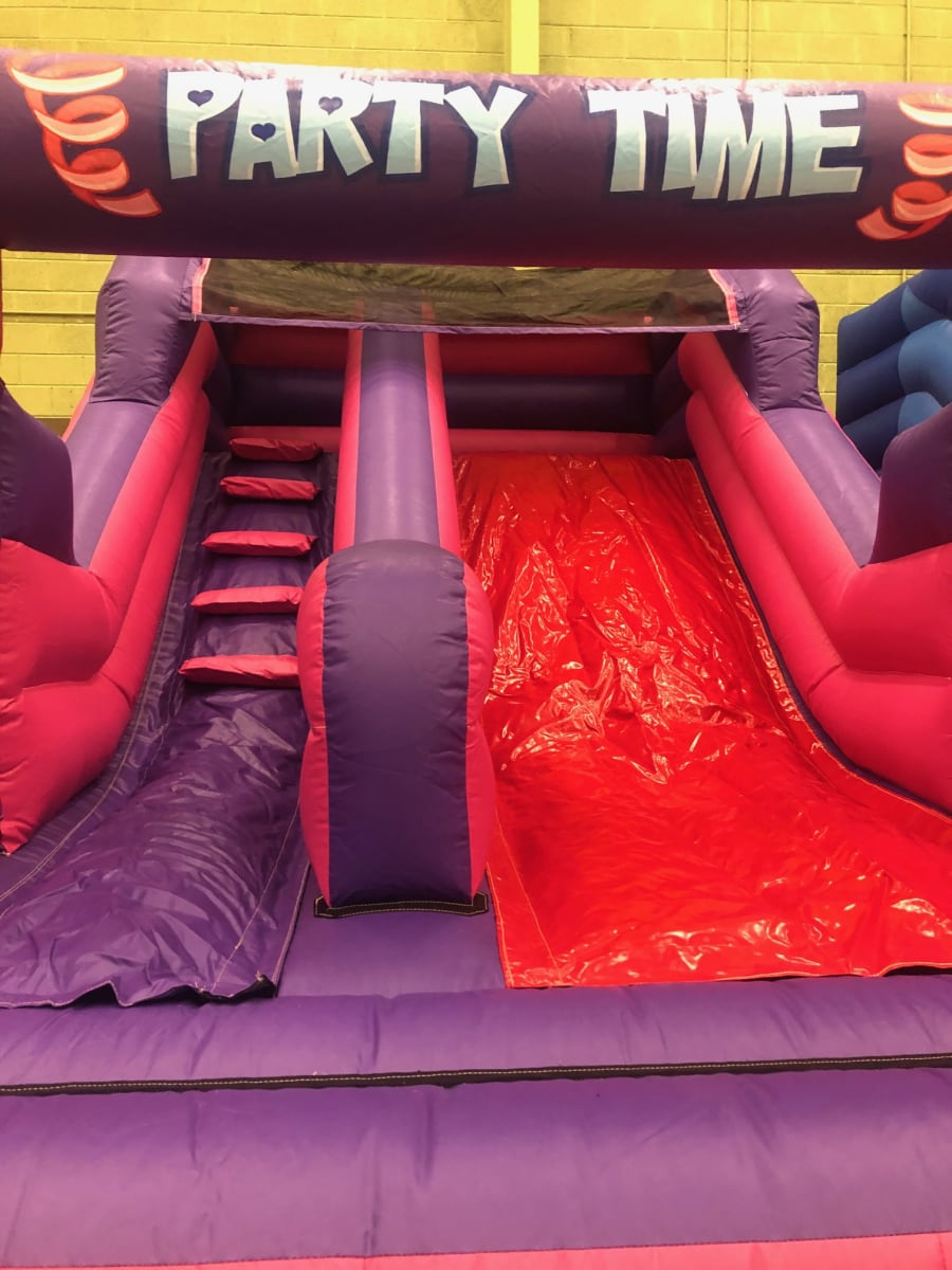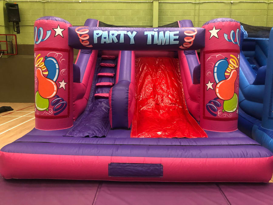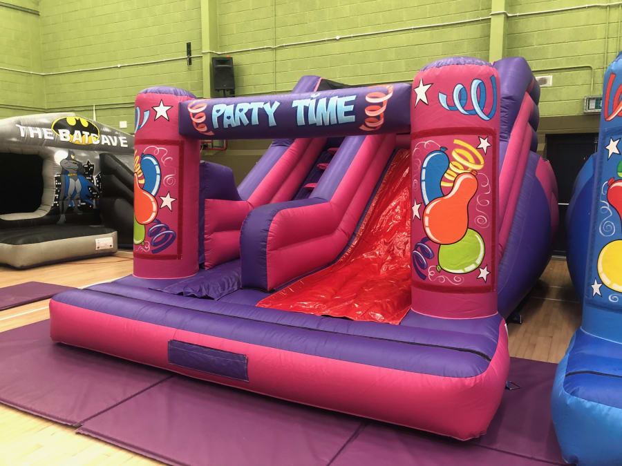 This red party time banner slide is a popular choice for kids , This castle is a wonderful inflatable slide with front facing step which allows for easy view while supervising children on this castle