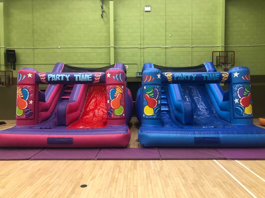 This blue party time banner slide is a popular choice for kids , This castle is a wonderful inflatable slide with front facing steps which allows for easy view while supervising children on this castle