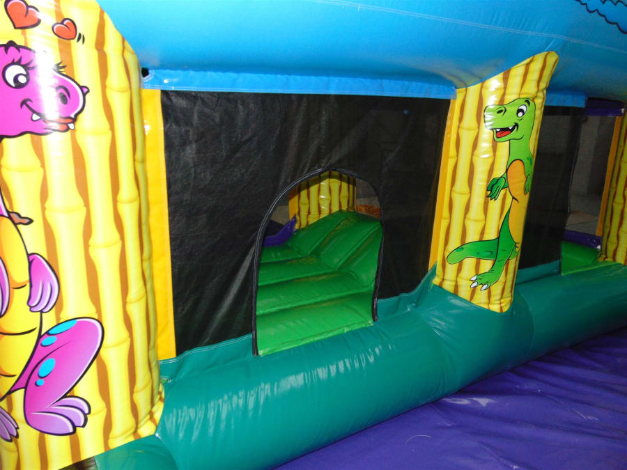 Beautifully painted with scenes from the Jurassic period, the bright colours and designs make this play zone one to remember. A small nook at the back for the adventurous types, soft play shapes for the future architects and air blowing cones for fun loving little tykes. Easy to supervise as the smaller children play in this - the land before time. This unit is presently for indoor use only